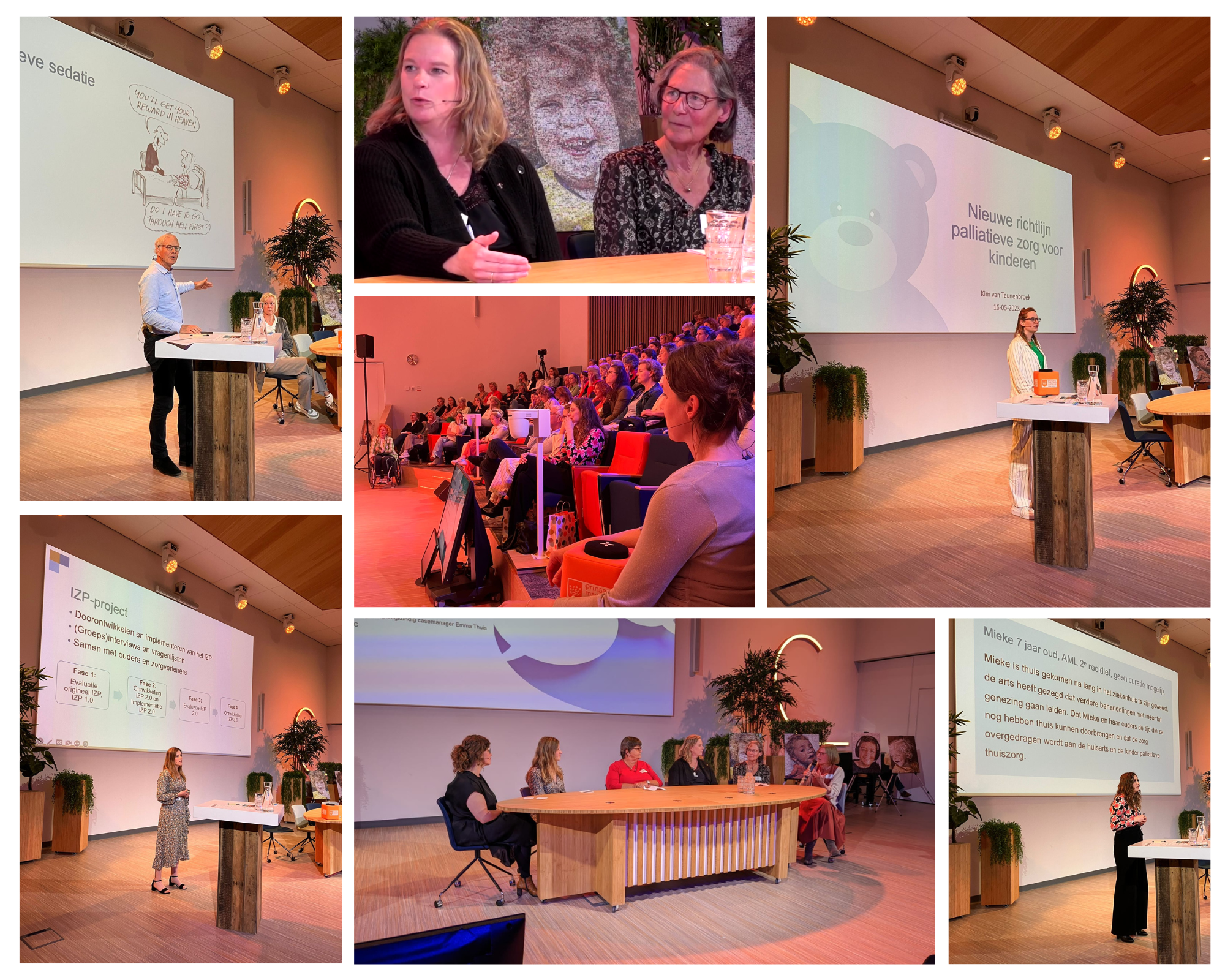 In het panelgesprek schoven Annette Groenenberg (coördinator Emma Thuis team, Emma Kinderziekenhuis), Judith Aris (assistent professor kinderpalliatieve zorg, Beatrix Kinderziekenhuis), Hennie Knoester (kinderartsintensivist, Emma Kinderziekenhuis), Marijke Kars (assistent professor, Julius Centrum Utrecht) en Bettina Sandbergen (ervaringsdeskundige ouder) aan bij Chantal. Ze gingen samen in gesprek over de meerwaarde van een IZP: