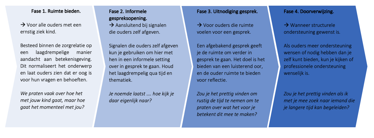 Door vanaf het begin op een laagdrempelige manier aandacht aan betekenisgeving te besteden, wordt het onderwerp genormaliseerd, en krijgen ouders het gevoel dat er ook aandacht is voor hun eigen zorgen en behoeften.
