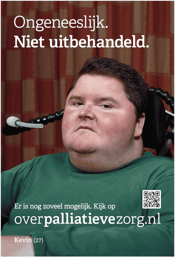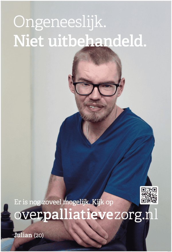 De gezichten van Julian (20) en Kevin (27) zijn deze weken op veel plekken in Nederland te zien. Samen met vijf andere mensen die ook een ongeneeslijke ziekte of aandoening hebben, doen ze mee aan de follow-up van de publiekscampagne ‘Ongeneeslijk. Niet uitbehandeld.’ Daarmee vragen ze er aandacht voor dat kinderen en jongeren ook palliatieve zorg nodig hebben.