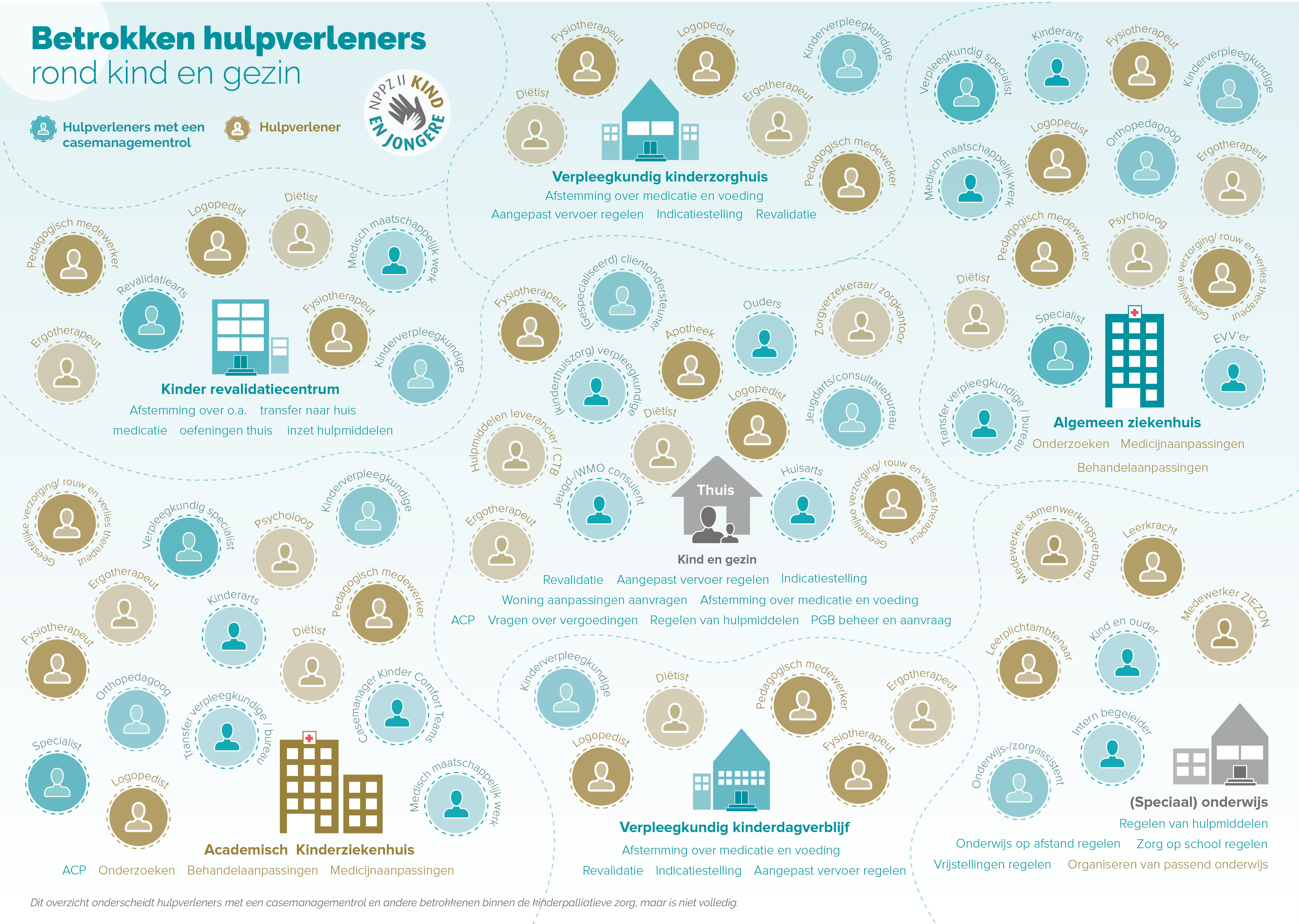 Bij een gezin met een ernstig ziek kind zijn vaak tientallen zorgverleners betrokken. Onderstaande afbeelding maakt dit inzichtelijk. Ook maakt deze afbeelding inzichtelijk welke van de betrokken (zorg)professionals nu al een deel van de taken rond casemanagement in hun takenpakket hebben.